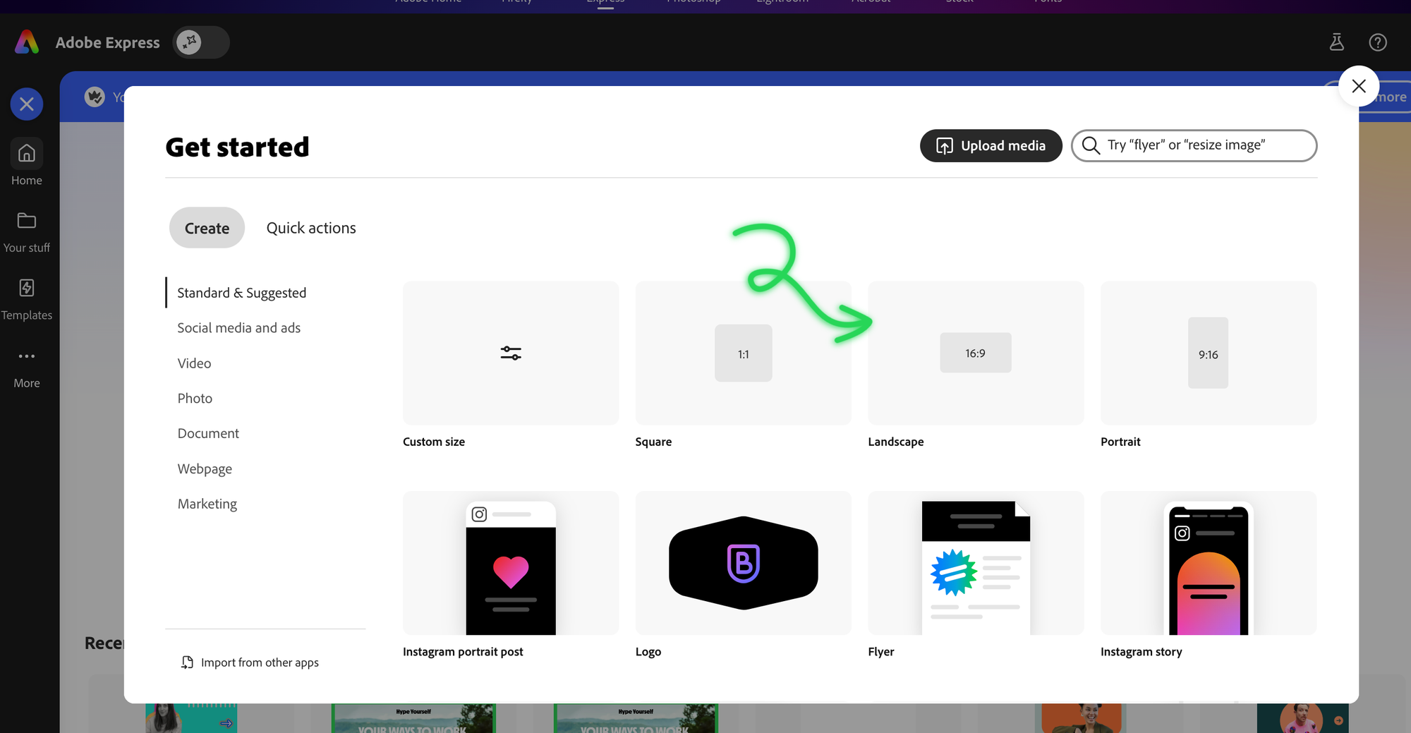 Under the Adobe Express A logo on the left, click + sign. Then select landscape.