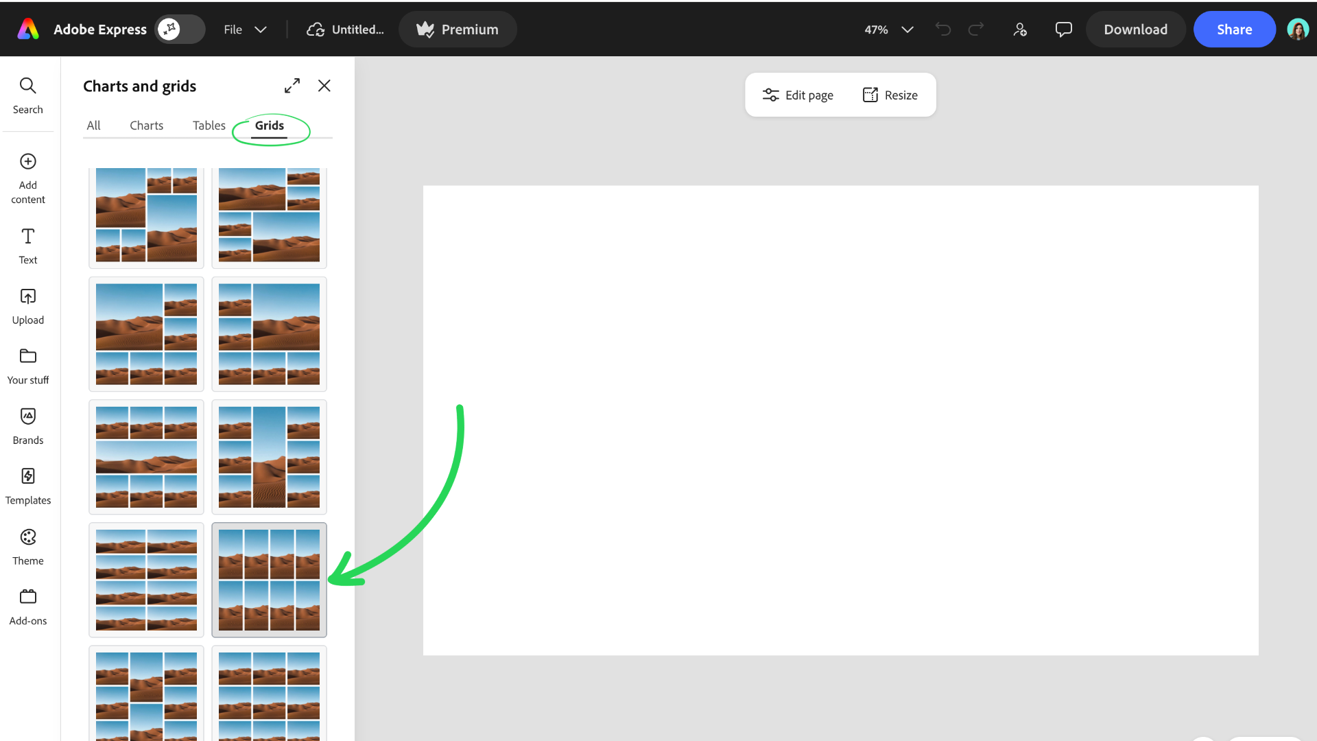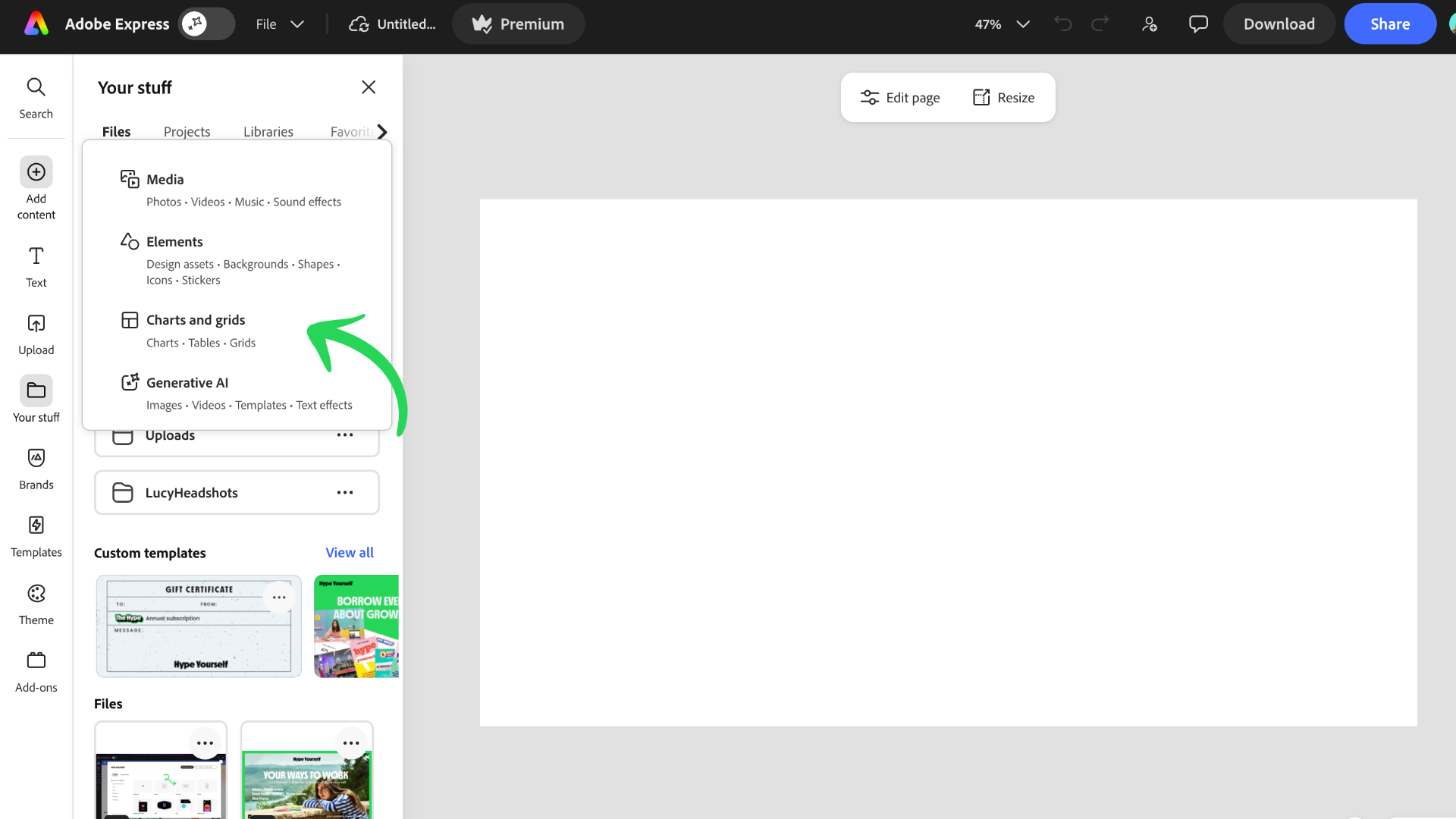 Under the Adobe Express A logo on the left, click the + Add content and select charts and grids.